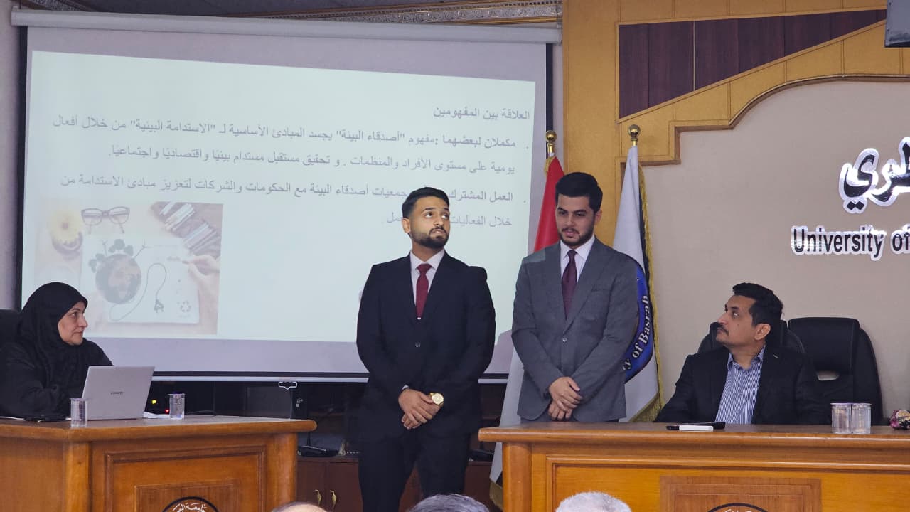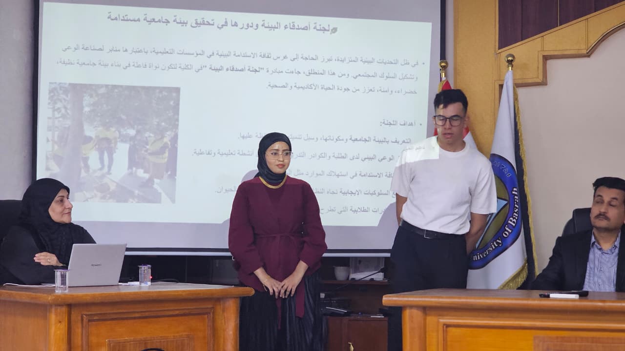 في إطار تعزيز الوعي البيئي في جامعة البصرة ... نظّمت كلية الطب البيطري ندوة للتعريف بلجنة أصدقاء البيئة، وتم خلالها استعراض لأهم مفاهيم الاستدامة داخل الوسط الجامعي.