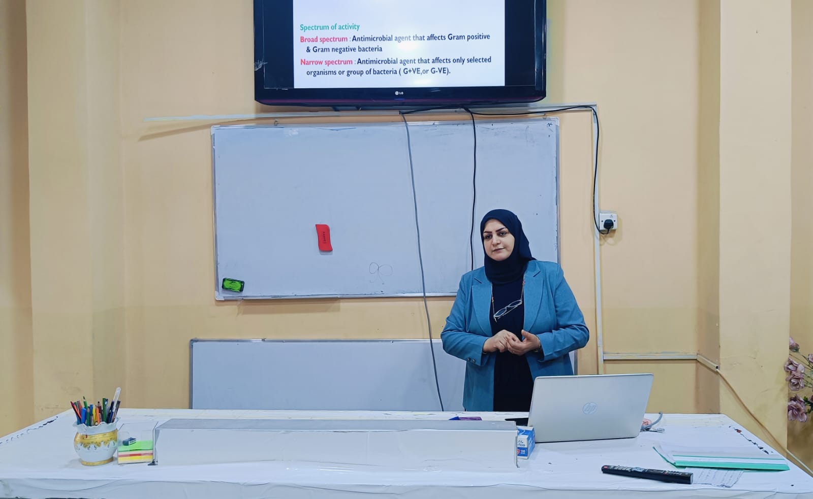 وتضمنت الدورة محاضرات قدمتها كل من التدريسيتين علياء سبتي جاسم وتماضر محمد خريبط، عن أنواع المضادات وتقسيماتها وآلية تأثيرها على البكتيريا، إضافة إلى الجانب العملي لتدريب الطلبة على إجراء اختبار حساسية المضادات داخل المختبر بصورة صحيحة.