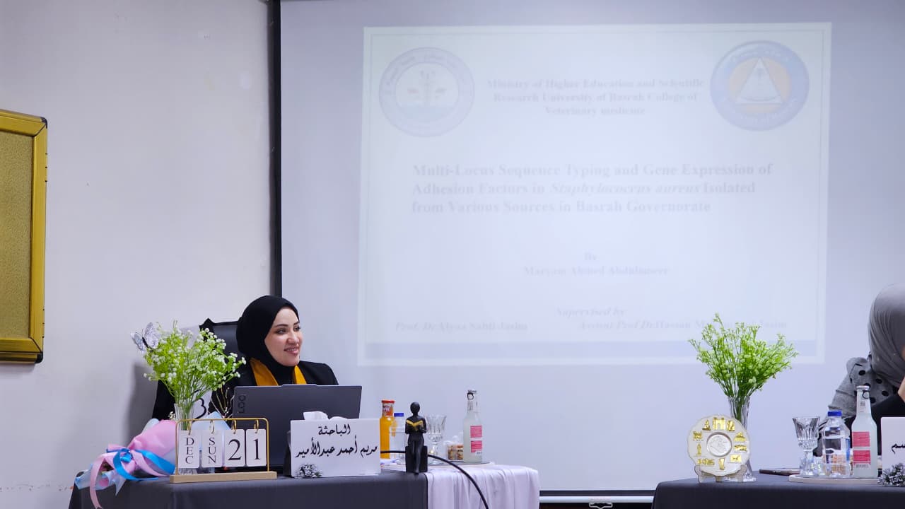 بحثت رسالة ماجستير في كلية الطب البيطري بجامعة البصرة "تحديد النمط النَسَلي متعدد المواقع (MLST) ودراسة التعبير الجيني لعوامل الالتصاق في بكتيريا المكورات العنقودية من مصادر مختلفة في محافظة البصرة".