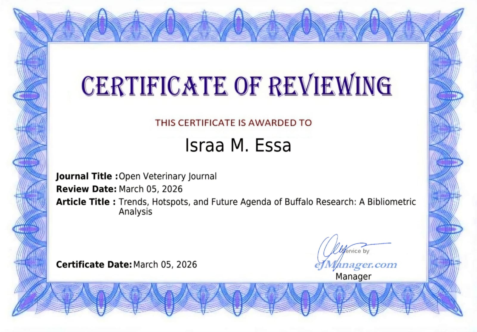 اختيرت التدريسية في كلية الطب البيطري بجامعة البصرة الدكتورة "إسراء محسن عيسى" مقيماً علمياً لمجلة Open Veterinary Journal.